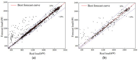 In the training set forecasting results, when the air conditioning system load is within 1200 and 2400 kW, the error between the load-forecasting results and the real value is basically within ±10%, and the load-forecasting accuracy is high; when the load of the air conditioning system is within 280 and 1200 kW, the predicted value of some data is far greater than the real value. In the test set’s forecasting results, it can be found that the error between most load-forecasting results and the real value is within ±10%. The absolute errors of the prediction results of the training set and the test set are counted. The data with an absolute error of less than 10% account for 92.22% and 88.27%, respectively, and the data with an absolute error of less than 20% account for 94.06% and 92.92%, respectively. The load-forecasting results have high accuracy.