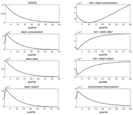 Figure 2 and Figure 3 show that the subsidy (tax) to the clean (non-clean) firm increases labor input and output of the clean sector, while the non-clean sector decreases correspondingly. This result is caused by the government’s environmental policies. Due to the production change, the household’s demand for non-clean consumption decreases, while the demand for clean consumption increases. The environment improves. However, it is different from the demand-driven environmental change in Figure 1. First, when facing the same-size shock, the impulse responses of two types of consumption in Figure 1 is significantly larger than those in Figure 2 and Figure 3. It means that the demand-driven force can directly influence the consumption goods market; in particular, the demand-driven force increases more clean demand and has a greater impact on the macroeconomy. Second, when facing the same-size shock, the impulse responses of the two types of outputs in Figure 1 are significantly larger than those in Figure 2 and Figure 3. As proportional subsidy or tax distorts the relative price of two types of consumption, it correspondingly affects (distorts) outputs in supply-driven cases. Third, the environmental improvement in Figure 1 is significantly greater than those in Figure 2 and Figure 3. Therefore, the result shows that demand-driven green consumption has a greater impact on economic fluctuations and environmental change; that is, the demand-driven environmental improvement performs better than the supply-driven.