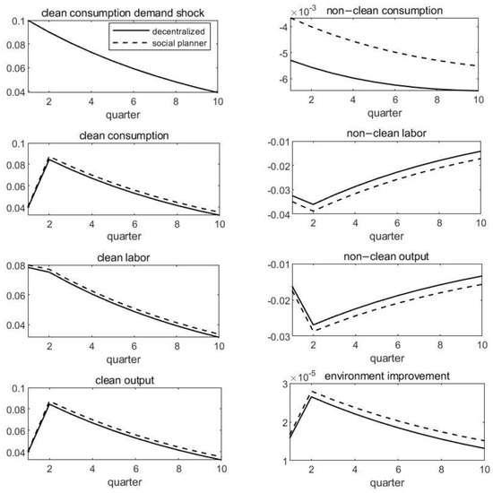This section reports the impulse response comparison between the decentralized and social planner equilibrium in Figure 4. First, when facing the same demand shock , clean consumption in social planner equilibrium increases more. Second, during the transformation of consumption structure, both the input and output of non-clean (clean) firm decrease (increase). Considering the negative impact of non-clean output on the environment from Equation (A21), non-clean output decreases more in the social planner equilibrium. Third, the impulse response of environment improvement is larger in the social planner equilibrium. It is consistent with the theoretical analysis above because social planners will take the negative environmental effects of non-clean output into account when allocating resources. Hence, Figure 1, Figure 2, Figure 3 and Figure 4 show that the government can achieve the optimal allocation and accelerate environment improvement at the same time by environmental policy of green consumption. This paper uses log-linearization and only imposes a small standard deviation. Thus, the impulse response value is small, but this does not affect the main mechanism.