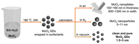 The MoO2 QDs wrapped in surfactants were prepared by a hydrothermal reaction. Specifically, 0.3 g of MoO3 was added into the mixed solution of 25 mL of deionized water and 15 mL of EG under vigorous stirring, in which EG works as a reducing agent and surfactant. Then, the mixed solution was transferred into a Teflon-lined stainless-steel autoclave (100 mL) and maintained at 180 °C for 24 h in an electric oven. After being washed and freeze-dried, the MoO2 QDs wrapped in a small amount of EG and its derivatives were obtained in powder form, and this un-calcined sample is denoted as Sample-U. Then, the MoO2 QDs wrapped in surfactants were put into a tube furnace for calcination under different conditions. Due to the boiling points of EG and its possible derivatives are lower than 300 °C, the calcination in air was performed at different temperatures (300, 350, 400, 450 and 500 °C) for a certain time (0.25~2 h), and the obtained samples are denoted as Sample-A (calcination temperature/calcination time). For example, Sample-A (400 °C/2 h) means the sample after calcination in air at 400 °C for 2 h. At the same time, the calcination in nitrogen and vacuum (~several Pascals) was conducted at 400 °C for 2 h, and the obtained samples are denoted as Sample-N and Sample-V, respectively. The schematic diagram of the preparation and calcination processes of the MoO2 QDs wrapped in surfactants are shown in Figure 1.