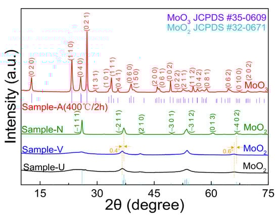XRD patterns of the Sample-U, Sample-V, Sample-N and Sample-A (400 °C/2 h).