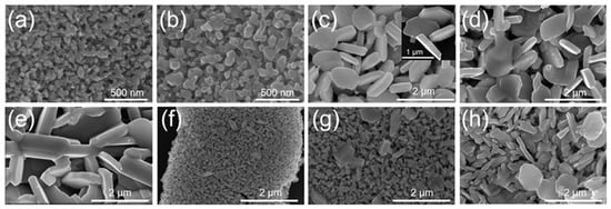 FESEM images of the Sample-A (300 °C/2 h) (a), Sample-A (350 °C/2 h) (b), Sample-A (400 °C/2 h) (c), Sample-A (450 °C/2 h) (d), Sample-A (500 °C/2 h) (e), Sample-A (400 °C/0.25 h) (f), Sample-A (400 °C/0.5 h) (g) and Sample-A (400 °C/1 h) (h).