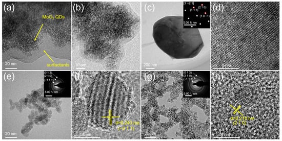 Besides calcination temperature and time, calcination atmosphere also affects the calcination process tremendously. In order to conveniently compare the Sample-N and Sample-V with the Sample-U and Sample-A (400 °C/2 h), their TEM characterization is all presented in Figure 4. Both Figure 4a,b are the TEM images of the Sample-U, which clearly display that the MoO2 QDs with particle size of 1.5~3 nm are wrapped by surfactants, and the surfactants are EG and its possible derivatives with low boiling points, which cannot be totally removed through conventional washing and drying processes. But, it can be seen that there are no surfactants any more in the Sample-A (400 °C/2 h), Sample-N and Sample-V, which means that the surfactants wrapping on the MoO2 QDs are totally removed after calcination under the corresponding conditions, as shown in Figure 4c–h. Figure 4c presents a MoO3 nanoplate of the Sample-A (400 °C/2 h), and its inset is the corresponding SAED pattern, which demonstrates its good crystallinity corresponding to its XRD result and lattice image in Figure 4d, and which also reveals that the thickness direction of the MoO3 nanoplate is parallel to the [1,2,3,4,5,6,7,8,9,10,11,12,13,14,15,16,17,18,19,20,21] direction and the crystallographic planes grow faster along the direction perpendicular to the [1,2,3,4,5,6,7,8,9,10,11,12,13,14,15,16,17,18,19,20,21] direction. Figure 4e presents the clear TEM image of the clean Sample-N with particle size of 5~11 nm, which demonstrates a slightly larger size than Sample-U, and the corresponding circular SAED pattern consisting of discrete bright spots in the inset is indexed to the (−1 1 1), (2 1 0) and (0 1 3) planes of the monoclinic MoO2, consistent with its XRD result. The possible formation mechanism is as following: when the Sample-N is being calcined in nitrogen (@1 atm), the surfactants wrapping on the MoO2 QDs will be continuously evaporated and a space with much lower pressure will be continuously formed simultaneously, and the pressure difference between small particles will push the particles together to grow larger. The lattice image of the Sample-N in Figure 4f shows a clear fringe spacing of 0.243 nm, which indicates the (−2 1 1) plane of the monoclinic MoO2. In Figure 4g, it is the clear TEM image of the clean Sample-V with particle size similar to that of the Sample-U, in which the inset is the corresponding SAED pattern with continuous circular line indexed to the (−1 1 1), (2 1 0) and (0 1 3) planes of the monoclinic MoO2, consistent with its XRD result. The possible mechanism is as following: during the calcination process of the Sample-V in vacuum, the surfactants wrapping on the MoO2 QDs are continuously evaporated without forming any pressure difference, which contributes to maintaining the initial positions of the MoO2 QDs and keeping them separate from each other, just like the surfactants do before the calcination. The lattice image of the Sample-V in Figure 4h shows a clear fringe spacing of 0.218 nm, which indicates the (2 1 0) plane of the monoclinic MoO2. In addition, an EDS result is collected in Figure S4 to verify the elements containing in the Sample-V, which are Mo and O except for Cu arising from the sample holder for TEM characterization, consistent with the XRD result. Based on the results above, it can be concluded that the calcination at 400 °C for 2 h is already proper in both nitrogen and vacuum to remove the possible surfactants, and vacuum is the best calcination atmosphere without changing the sizes of the MoO2 QDs.