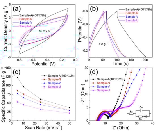 CV curves (a), CD curves (b), specific capacitance (c) and Nyquist plots (d) of the Sample-U, Sample-A (400 °C/2 h), Sample-N and Sample-V; the inset in (d) is the proposed equivalent circuit.