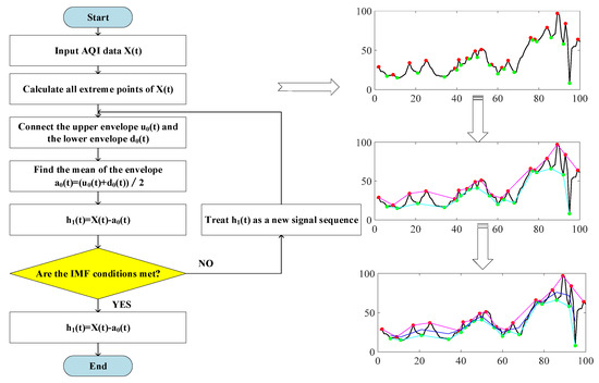 As an adaptive signal decomposition method, EMD was extensively used to decompose time series into multiple intrinsic mode function (IMF) and a residual component [36,37,38]. In turn, the IMF components were determined by satisfying two conditions: