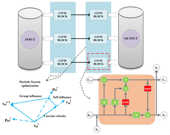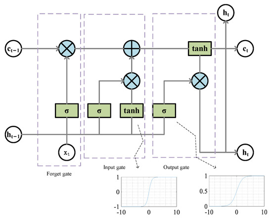- The output of and the current input were used as the inputs of the forgetting gate to obtain the output value of the forgetting gate based on Equation (1).where and were the parameters of the forgetting gate, was the activation function which typically used the sigmoid function, and the value range of ranged between 0 and 1. After the forgetting gate, the state vector of the LSTM was .