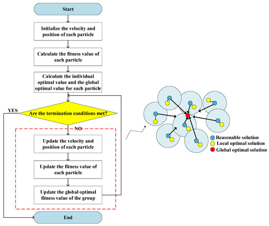 The PSO algorithm is used frequently to optimize complex numerical functions [41]. It originated from the study of the predatory behavior of bird flocks. In the PSO algorithm, there were several particles in the search space, wherein the algorithm attempted to optimize fitness functions. Every particle calculated its own fitness value based on its position in the search space. By combining information about its current position and its previous optimal position, the direction along which it would move was chosen. To obtain the final answer, these steps were repeated several times until the end condition was met [42,43,44]. Figure 5 shows the search process of the standard PSO.