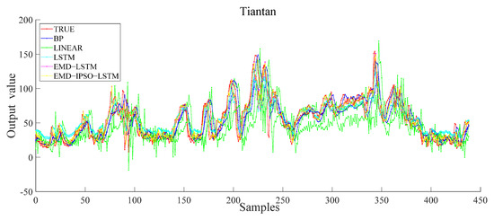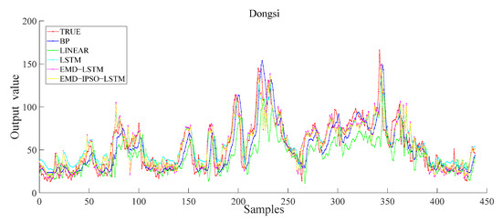To prove the effectiveness of the proposed model, we performed comparative experiments. The input characteristics of each model are seven-dimensional sequence data, and the output are one-dimensional data. We selected the data from the Dongsi monitoring station and used the five models of BP, LR, LSTM, EMD–LSTM and EMD–IPSO–LSTM to obtain the predicted values. Accordingly, the predicted values were compared with the true values. Then, the error was calculated to obtain the experimental result. Figure 10 shows the results of the Dongsi site. The results show that the EMD–IPSO–LSTM can better extract the potential characteristics of air quality data and has certain advantages in the prediction of AQI.