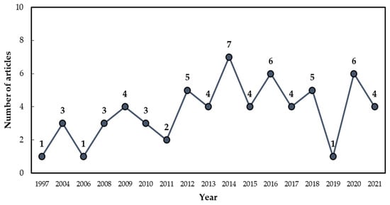 The oldest article found (1997) dealt with fishermen’s TEK on fish occurrence patterns at various spatio-temporal scales in the Fatala Estuary in Guinea, West Africa []. Among the results, they emphasized that the TEK investigation should be used as a preliminary analysis to help define sampling projects in tropical rivers and estuaries.