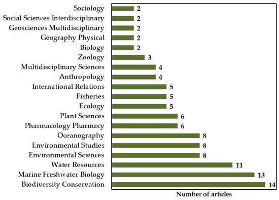 Many of the studies on traditional ecological knowledge are related to different areas within the academic environment, often interconnected. For understanding purposes, the more frequent Web of Science areas are showed in Figure 3. Biodiversity conservation was the one that most frequent, aiming to analyze temporal patterns, fish diet, reproductive cycle, fish spawning, biological and ecological characteristics, fish behavior, and the spatial and temporal variation of species.