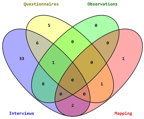 Then, the data found in Excel for Windows spreadsheets were tabulated. For the organization, we categorized as follows: nature of the work, title, year, authors, abstract, keywords, audience participating in the research, data collection instruments, and place of publication. We used the research areas of Web of Science to illustrate the main areas of the papers on TEK. We created a Venn diagram to compare the use of the four most used data collection instruments by the authors, using the interactive tool Venny 2.1 [].