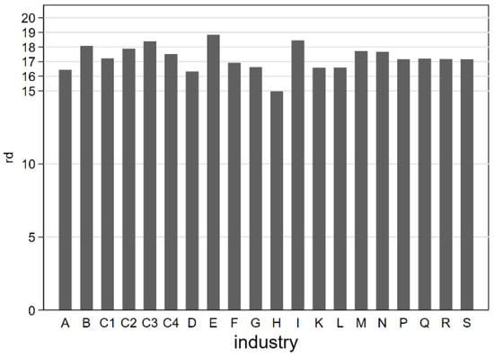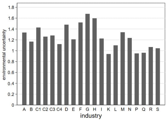 As can be seen from Figure 1, the industries greatly affected by environmental uncertainty are railway transportation, storage and postal (G), accommodation and catering (H), wholesale and retail (F), electricity, heat, gas and water production and supply (D), and food, textile and leather manufacturing (C1). Sectors less affected by environmental uncertainty are real estate (K), education (P) and health and social work (Q). As can be seen from Figure 2, R&D investment varies significantly by industry. Industries with high R&D investment are construction (E), information transmission, software and information technology services (I), and non-metal, metal and mechanical equipment manufacturing (C3). The sector with low R&D spending was accommodation and catering (H).