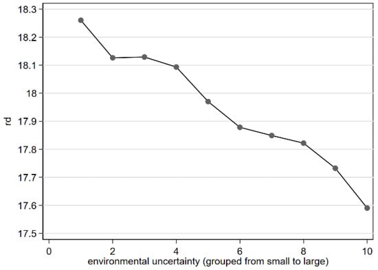 Table 3 reports the Pearson correlation coefficients of all variables. On the whole, the correlation coefficient between variables is small, indicating that the existence of multicollinearity in the regression model is less likely. The coefficient of eu and rd is −0.091, which is significant at least at the 1% level, indicating that the higher the degree of environmental uncertainty is, the lower the innovation input is when the influence of other factors is not taken into account. Hypothesis 1 is preliminarily satisfied. In addition, this paper divided the samples into 10 groups according to eu from small to large, and the changes of the mean rd of each group are shown in Figure 3. It can be seen that environmental uncertainty is negatively correlated with innovation input on the whole. As the degree of environmental uncertainty increases, corporate innovation input decreases, which also conforms to the expected results of Hypothesis 1.