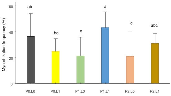 Interaction between phosphorus (P) and lime (L) inputs on the rate of mycorrhization. Different letters indicate significant difference among the treatments according to post hoc Tukey HSD test at p-value < 0.05.
