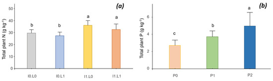 Interaction between inoculation (I) and lime (L) on the total plant N (a) and phosphorus (P) effect on the total plant P of common bean (b). Different letters indicate significant difference among the treatments according to post hoc Tukey HSD test at p-value < 0.05.
