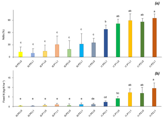 Inoculation (I), phosphorus (P) and lime (L) interaction on the %Ndfa (a) and the amount of fixed N (b). Different letters indicate significant difference among the treatments according to post hoc Tukey HSD test at p-value < 0.05.