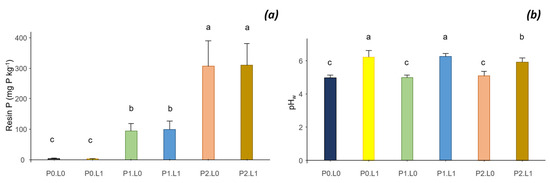 Interaction between phosphorus (P) and lime (L) on the soil Resin P content (a) and soil pH (b). Different letters indicate significant difference among the treatments according to post hoc Tukey HSD test at p-value < 0.05.