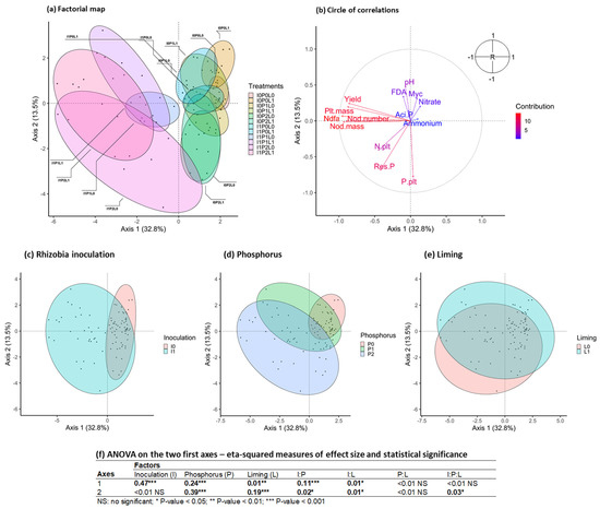 The factorial map of the PCA (Figure 8a) showed a clear distinction between the noninoculated treatments, positioned on the positive scores of the first axis, and the inoculated treatments with the negative scores. However, only the inoculated treatments that received P had negative scores, whereas the treatments inoculated without supply of P had positive scores similar to the noninoculated treatments. The second axis of the PCA opposed the treatments following the level of P (the positive scores corresponding to the absence of P supply) and, to a lesser extent, according to the supply of lime (the negative scores corresponding to the absence of lime supply). The individual effects of the treatments were highlighted in Figure 8c–e and by the statistical results of the ANOVA carried out on the first two axes (Figure 8f).
