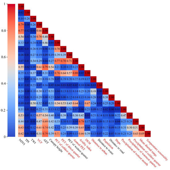 In total, we obtained 52 input variables, including 7 topographic, 5 vegetation, 5 anthropogenic, and 35 climatic variables. In order to avoid overfitting, highly correlated variables were removed. We calculated Pearson’s correlation coefficient between all variables and removed variables with |r| > 0.8 (Figure 2) [16,76]. The remaining 22 variables were input into the MaxEnt model as predictor variables; however, the variables with contributions less than 1% were removed [77]. Finally, 15 independent variables were used to model the suitable habitat area for Asian elephants (Figure 2).