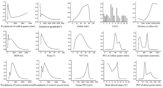 Among the 15 environmental variables in the model simulation, the 5 variables with the highest contributions included precipitation of coldest quarter, population, aridity index, LULC, and distance to urban area, which accounted for 71.6% of the modeling results (Table 4). The response curves for these five variables showed that elephants prefer forest and mixed areas with trees and shrubs, and herbaceous, relatively dry environments with high PET, free from high human impact (Figure 4).