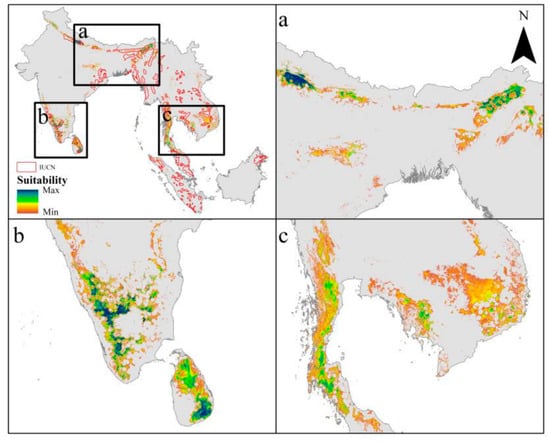 Habitat suitability mapped by MaxEnt and the distribution of Asian elephants mapped by IUCN. (a–c) details of habitat suitability in the black rectangle.