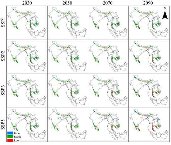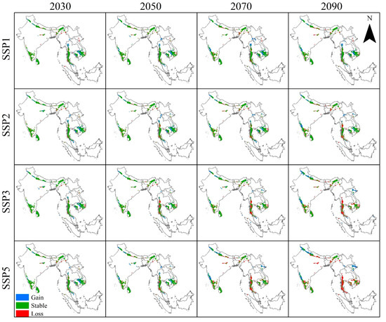 The current potential distribution of elephants was superposed with the potential distribution in future scenarios to obtain the spatial change of habitats (Figure 6). The results indicated that the spatial changes in the potential distribution of elephants would display the same trend under four scenarios. The suitable area increased initially and then decreased at the 2050 or 2070 mark (Figure 7). The modeled suitable areas were mainly located in India and the border of Thailand, Myanmar, and Laos, expanding northward, while the decrease mainly occurred in Thailand.