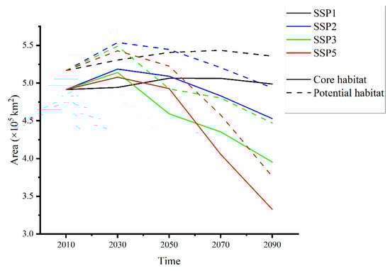 We also evaluated the protection efficiency for existing protected areas in protecting the core habitats (Figure 14). Overall, the protection efficiency of the existing protected areas increased by the 2030s under all scenarios, with the highest value of 28.34% under the SSP1 scenario. Even under the SSP5 scenario by the 2090s, the conservation efficiency was still shown to be 23.73%, with a lower rate of decrease. We combined all the core habitats under all 17 scenarios and identified approximately 219,545 km2 of land as areas that should be protected as a priority (Figure 15), which could provide a basis for the establishment of future PAs.