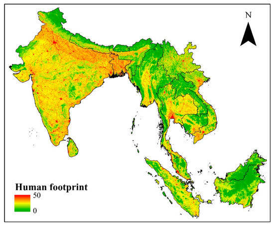 Our results showed that the human footprint value increased rapidly in Vietnam and Cambodia due to the massive local deforestation and rapid expansion of cultivated land. Although the human footprint value growth in India and Sri Lanka was not significant, it reached a relatively high level. Native forest loss and land degradation, which affect about 18% of India’s territory [102,103], are major threats to its biodiversity and will decrease the availability of forage for wild herbivores [104,105]. Higher levels of importance should be attached to human pressure in future endeavors to protect the habitats of Asian elephants.