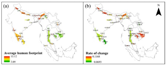 We mapped the HF in South and Southeast Asia during 2000–2018 (Figure 10). In core habitats for Asian elephants, the human footprint continued to increase over the 19 years studied, but the changing rate slowed down in recent years (Figure 11). The core habitats located in India had high HF values, and core habitats in other regions had low HF values (Figure 10 and Figure 12a). We calculated the changing rate of HF using the least-squares regression method (Figure 12b). The HF’s major regions that changed substantially were the core habitats with low HF values, such as Vietnam and Cambodia. The core habitats with higher HF values in southern India and Sri Lanka changed slightly.