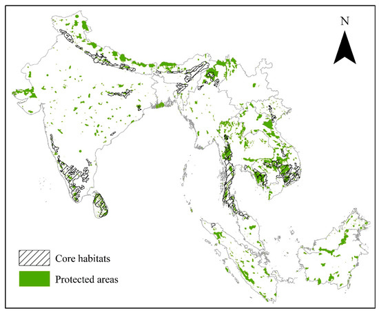 Gap analysis is a popular method for use in evaluating the effectiveness of PAs [16]. In order to assess the effectiveness of existing PAs, we compared the core habitats with existing PAs [90]. Then, we extracted core habitats inside and outside the PAs and calculated their area and proportion to evaluate the conservation efficiency of the existing PAs.