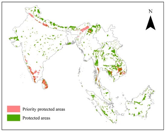 Distribution of areas that should be protected as a priority for Asian elephants.