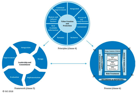 ISO 31000 [12] is the main ISO guideline for risk management and according to ISO the standard “provides a common approach to managing any type of risk and is not industry or sector specific” (https://www.iso.org/standard/65694.html, accessed on 9 March 2022). It is intended for general guidance on risk management systems and not for certification. The first version of the standard was published in 2009 and this case study was originally based on that version. In an updated version, published in 2018, the principles of risk management have been reviewed. Greater emphasis is put on leadership by top management to ensure that risk management is integrated into all organizational activities, starting with the governance of the organization [28]. Greater emphasis is also put on the iterative nature of risk management, drawing on new experiences, knowledge, and analysis for the revision of process elements, actions, and controls at each stage of the process. According to the standard, risk management is based on the principles (described in clause 4), framework (described in clause 5), and process (described in clause 6). This is illustrated in Figure 1.