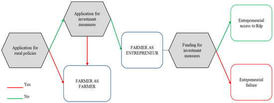 As evidenced in Figure 2, no access and access but not for investment measures identify a farmer with low entrepreneurial orientation, already depicted in literature as “farmer as farmer” [32]. On the other side, accessing rural policy to support strategies of investments turn the farmer into an entrepreneur, aimed at gaining access to RDP with the purpose of supporting innovative and risk-taking strategies.