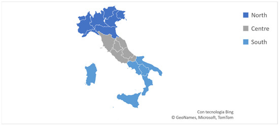 The analysis was carried out entirely using the three Italian macro territorial areas, the North, which comprises the regions of Valle D’Aosta, Piedmont, Liguria, Lombardy, Emilia-Romagna, Trentino Alto Adige, Veneto, and Friuli Venezia Giulia, the Centre, which comprises the regions of Tuscany, Umbria, Marche, Lazio, Molise, and Abruzzo, and finally the South, which comprises Campania, Apulia, Basilicata, Calabria, Sicily, and Sardinia, as shown in the following figure (Figure 3).