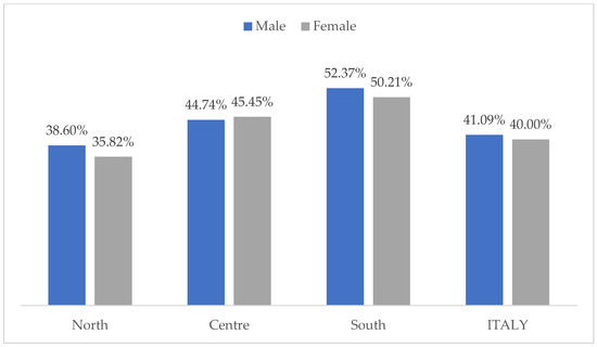 Our results evidence that 40.1% of farms applied for rural policies with a balanced score among male and female farms (Figure 4). Territorial differences emerge in terms of a higher propensity to consume policies in Southern Italy (more than half of farms applied for RDP), while the lowest percentage is registered in Northern Italy (38.6% for males and 35.8% for females).