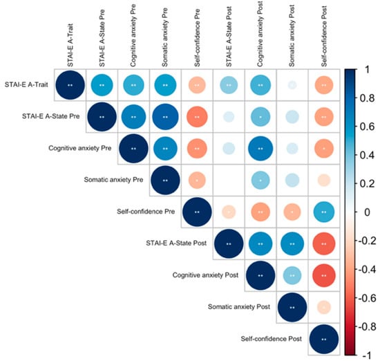 Correlations between pre and post-competitive values of the variables related with anxiety and self-confidence. (* p < 0.05; ** p < 0.01).