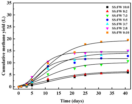 Cumulative methane yields with time in AcoD of SS and FW. (Symbols represent the experimental data, and solid lines represent the modified Gompertz model fit.)