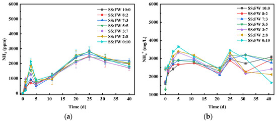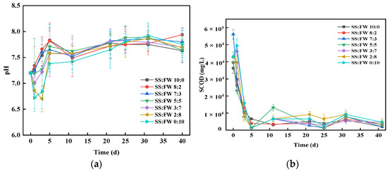The pH is a key parameter that reflects the stability of AcoD. Figure 2a showed the variation of pH under different AcoD ratios. The pH value of each group dropped rapidly to around 6.4 in the early stage (0–3 day), then increased and stabilized between 7.2 and 8.0. The highest pH was 7.9 at the ratio of 2:8, while the lowest pH was 7.6 at the ratio of 3:7. Noticeably, the pH changed more significantly with high FW ratios (0:10 and 2:8). This observation could be attributed to the organic matter in FW that produces a large quantity of VFAs in the early stage of the process. Consequently, the VFAs made the rapid drop of pH. Then, afterwards, the continuous release of ammonia made the anaerobic environment alkaline. This could facilitate the growth of methanogens. It was reported that the optimal pH range of methanogenic activity varies between 6.5 and 7.5.