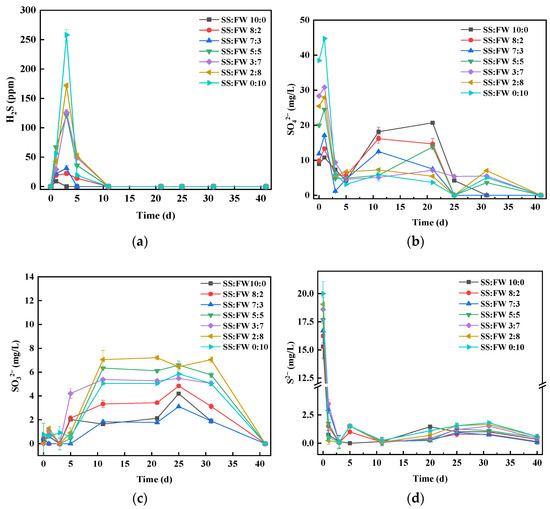 Dynamics of sulfur chemical forms: (a) variations of H2S during AcoD process; (b) variations of SO42− during AcoD process; (c) variations of SO32− during AcoD process; (d) variations of S2− during AcoD process.