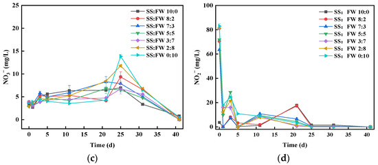 As shown in Figure 4c, the NO3− increased from the beginning and reached a peak on Day 25, while the ratio of SS:FW = 0:10 reached 13.86 mg/L. The result was consistent with that group of I/S ratio = 1:0 by Zhang et al. [27]. From Day 20, the NO3− increased for all ratios given the recovery of nitrification as evidenced by the declined of NH4+. The low molecular organics in the FW could be easily utilized by microorganisms, resulting in a faster denitrification rate. However, solid and macromolecular organics were firstly hydrolyzed into soluble organic matter before being utilized by denitrifying bacteria, so as to cause a lower denitrification rate [28,29]. Additionally, at the end of the AcoD, the NO3− was not removed completely, and its content was slightly higher than the initial stage of the reaction, indicating the incomplete denitrification. The reason for the low denitrification rate is that the solid organic matters in FW were converted by hydrolase before being utilized by denitrifying bacteria [29].