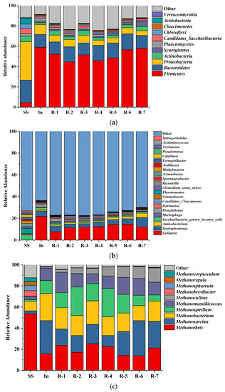 Microbial community structure in AcoD systems: (a) bacteria at the phylum level; (b) bacteria at the genus level; (c) archaea at the genus level.