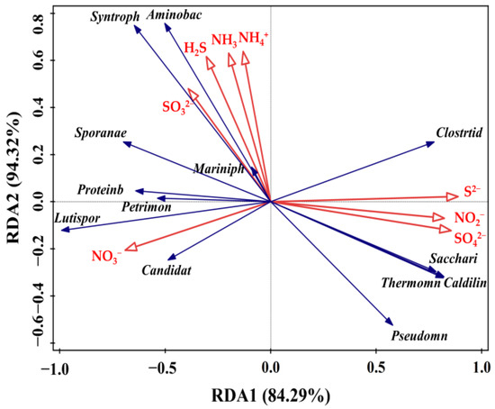 RDA was used to determine the correlation between the bacterial community and different dynamic parameters. As shown in Figure 6, the effect of S compounds on bacterial genera was displayed as follows: S2− > SO42− > H2S > SO32−, while the effect of N was NO2− > NH3 > NH4+ > NO3−. Obviously, the dominant genus Syntrophomonas and Aminobacterium were positively correlated to H2S, NH3, NH4+ and SO32−, but negatively correlated to NO2− and SO42− which positively correlated with Saccharibacteria_genera_incertae_sedis and Thermomonas. The Syntrophomonas and Aminobacterium could not only participate in the degradation process of butyric acid and amino acids but also could indirectly intensify the performance of AD [42]. Notably, the SO42− had a positively relationship with NO2−, and electron transfer might have occurred between them under the action of specific microorganisms. It has been confirmed that Pseudomonas has denitrification and desulphurization functions [43]. Thermomonas was always associated with N removal, especially with denitrification [39]. As for Candidatus_Cloacamonas, which was positively correlated to NO3−, it was commonly associated with amino acid degradation [34]. These results suggested that N and S compounds had great influence on the structures of bacterial communities in the AcoD process and could be used as important indicators to effectively regulate the microbial ecosystem during AcoD.
