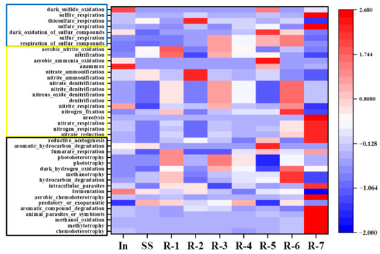 FAPROTAX (Annotation of Prokaryotic Taxa) was adopted to evaluate the metabolic pathways of N and S cycles in the AcoD. As shown in Figure 7, the abundance of functional groups involved in the cycles of N and S showed an increase with the ratio of SS:FW. In the reactor R-7, the presence of anaerobic regions in FW resulted in notable ureolysis, nitrate respiration, nitrogen respiration and nitrate reduction, thereby contributing to high NH4+. Bacterial functions for the S cycle were dominantly composed of sulfite and sulfate respiration. These functions made contributions to the notable H2S emission. Compared to the R-1, these bacterial activities were more abundant. Given their more severe anaerobic conditions, they would lead to much higher H2S and NH3 emission inside the composting pile with merely the FW only. These results were also consistent with previous bacterial community analysis.
