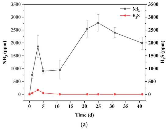 Dynamic of nitrogen chemical forms: (a) variations of NH3 during AcoD process; (b) variations of NH4+ during AcoD process; (c) variations of NO3− during AcoD process; (d) variations of NO2− during AcoD process.