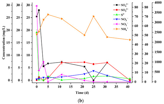 After H2S was produced in aqueous solution, it could dissociate into hydrosulfide ions (HS−) and then sulfide ion (S2−). It was clearly found in Figure 3d that S2− concentrations decreased rapidly at the beginning of AcoD; then, all reactors fluctuated below 7 mg/L. It indicated that S2− was readily converted to other sulfur compounds under anaerobic conditions and mainly in gaseous H2S accumulation, not in the aqueous solution.
