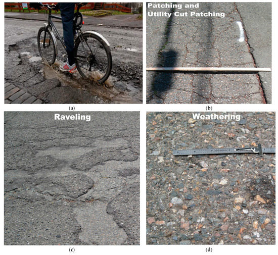 Examples of flexible pavement distresses affecting bicyclists: (a) Potholes [2]; (b) Cracking and Rough cut Utility Patching [3]; (c) Raveling [3]; and (d) Weathering [3].