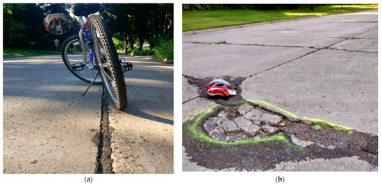 As more bikeways are built on roads, the timely application of maintenance treatments becomes critical to ensure safe and comfortable conditions. Longitudinal and transverse cracks that progress to potholes, and rough utility cut patching are flexible pavement distresses that represent a safety threat to bicyclists as shown in Figure 1a,b. Raveling and weathering also expose bicyclists to a very rough, uneven surface due the loss of aggregates as shown in Figure 1c,d. Rigid pavement distresses such as faulting (different elevation across a joint) and spalling (break down of the slab corner edges) are also a safety hazard to bicyclists as shown in Figure 2a,b.