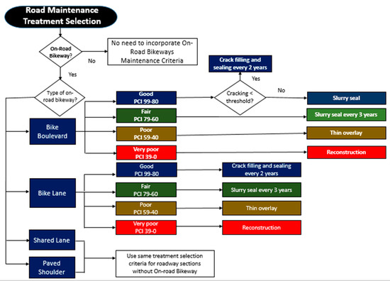 DOTs perform on-road bikeways routine maintenance, including sweeping and fixing potholes as reactive maintenance to a reported problem [21]. On-road bikeways located in urban areas could receive maintenance with the street pavement section prioritized with the aid of Pavement Management Systems (PMS) [21,22]. However, the prioritization in PMS is often based on motorized vehicles criteria without considering the needs of bicyclists who are more sensitive to pavement distresses.