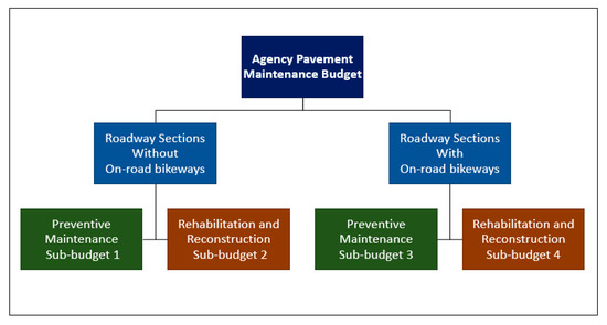 In PMS, sections in need of maintenance, with and without on-road bikeways, compete for limited funds. The results of the integrated methodology for budget allocation will be budgets for roads with and without on-road bikeways divided into sub-budgets categories for preventive maintenance, rehabilitation, and reconstruction. Figure 5 shows the sub-budget categories, in which maintenance projects compete for funding. It illustrates that bikeway maintenance programs should preferably have their own budget.