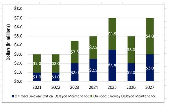 Critical delayed bikeway maintenance should be clearly identified in the reports, as deferred maintenance will cause safety hazards to bicyclists. Figure 6 shows an example to differentiate critical delayed maintenance funds required for pavement sections with on-road bikeways and those sections without. A $1 million delayed maintenance on-road budget for bikeways categorized as critical in 2021 increased to $3 million in 2027. The total amount of delayed maintenance increases from $3 million to $7 million in the same period. Critical maintenance should not be delayed because on-road bikeways in critical conditions increase future budget needs and compromise road users’ safety.